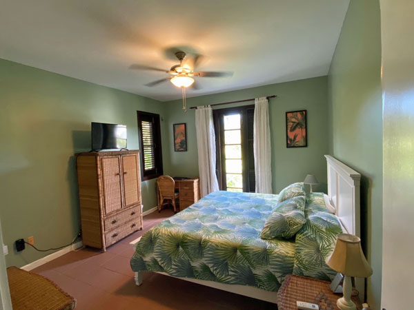 The master bedroom features a king size bed, air conditioning, ceiling fan, tv, and bath en suite and offers beautiful views looking out.