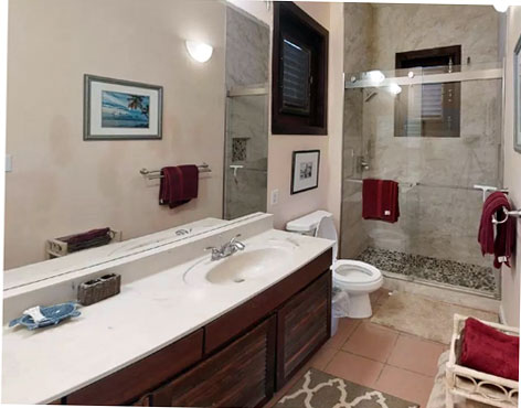 Both bedrooms feature baths with dual sinks and walk in marble showers.