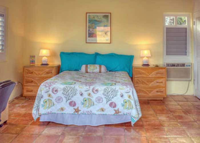 The master bedroom off the living room area is spacious, features air conditioning, king bed, ceilng fan and bath en suite and offers beautiful views out to the pool deck through the french doors.