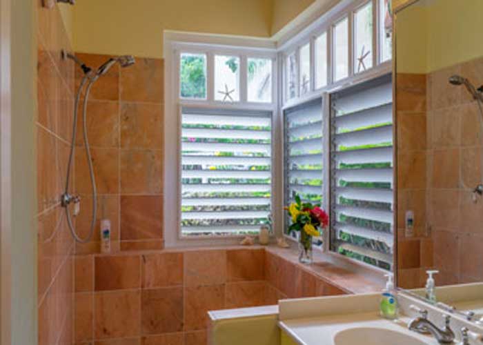 The second master bedroom suite is upbeat in tropical colors and features a king size bed, air conditioning, ceiling fan, bath ensuite and views out to the deck. The arrangement is perfect for two couples traveling together!